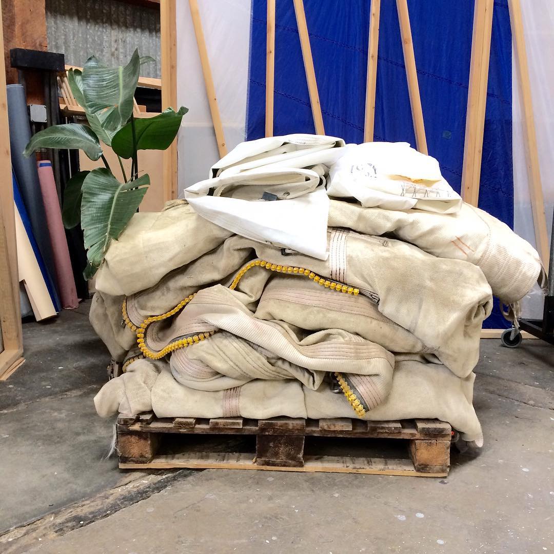 The Ocean Cleanup aims to rid the worldβs oceans of plastic with the development of their passive cleanup technology, which consists of a 2000-foot floating pipe and a 10-foot skirt attached beneath. The skirt section we used is retired from a tow test they performed on their cleanup system in May. We received the skirt at our studio in San Francisco which we then cut into smaller panels, washed, and sewed into a final product.