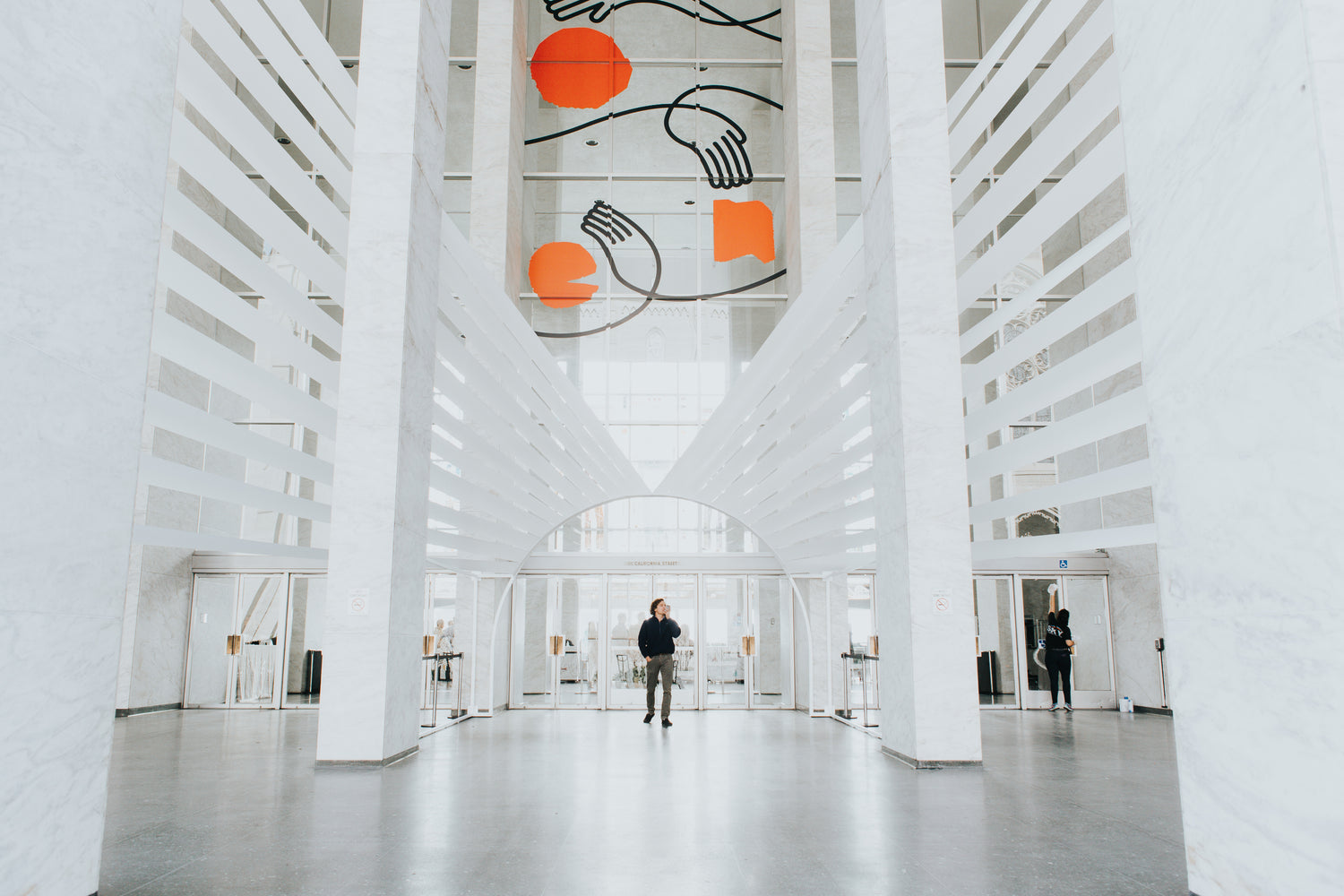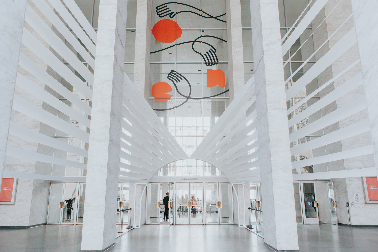 We used 1000 sq feet of sails to create an entry arch at the Masonic Center in SF.Β All the sails converged at one point. Below, employees of a company we can't mention came together for their global conference.Β