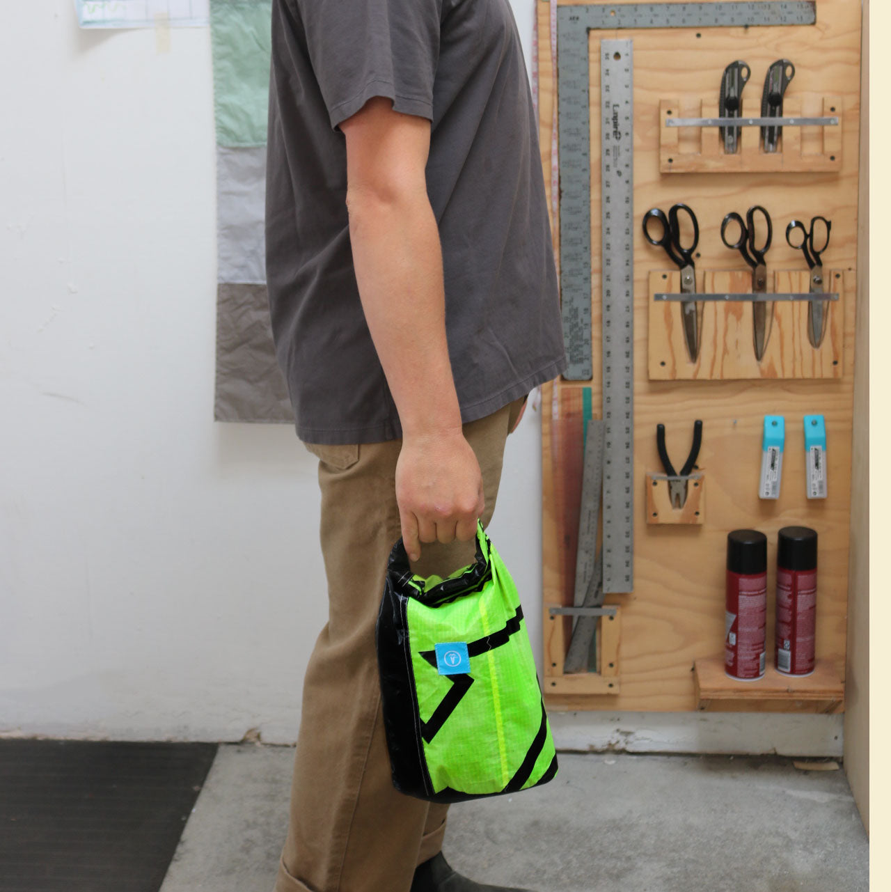 The Mini Mafia is our stuff sack featuring a roll-top closure with a quick release buckle. It is ultralight, water-resistant, and durable. Made from a combination of kitesurf and boat sails.